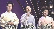 From damien, location Alaska, date Thursday, June 28, 2007 at 19:45:19 Barbara, thanks for a very informative website. I am 56, a biotech scientist in southwest Michigan. I usually discover new music from movie or TV soundtracks, and that's how I discovered Meiko Kaji. I had a suspicion this might be a whole genre of music, so a little research turned up Enka, which I never knew existed. I listened to all your sound clips and fell in love with Kaori Kozai and Sayuri Ishikawa. I bought the 4 disc 20th anniversary set of Kozai from CDJapan and really enjoy it. Ordering form them is really expensive. If you know of any store in Chicago let me know. San Francisco is a long shot for me. I plan to order some of your videos. I saw the clip you have of Yoko Nagayama playing the shamisen. It is the same or similar performance to a clip I found on Youtube:
